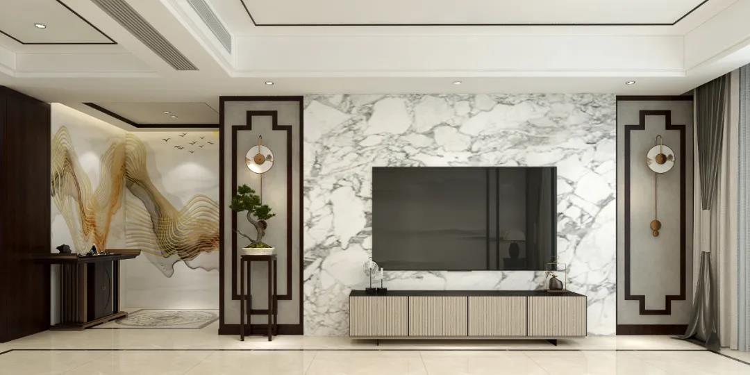 客廳設計上采用濃厚的新中式元素,不論是墻面的山水畫、還是線條勾勒如窗欞的花紋裝飾,無一不透露著中式獨有的詩畫韻味。電視墻采用大理石花紋,靈動自然、奢華尊貴,再加以盤虬盆栽,打造出極富古典氣息的空間氣質。