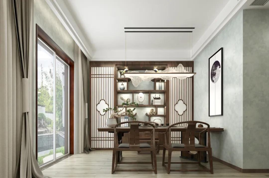 獨立茶室既是待客休閑之所,也能作書房之用。仿古典柜體的設計與山水式吊燈映襯,室內空間嫻靜雅致,恍惚已有茶香滿室。