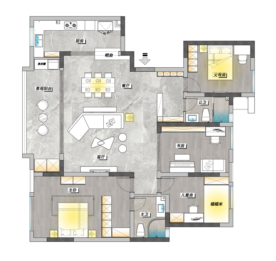 原始結構圖 平面布置動線圖 設計平面布置圖 玄關放置換鞋凳,家中老人進出換鞋更方便。一旁的小吧臺能很好地起到隔斷作用,將父母房和衛生間隔開,使精簡功能分區更明確。吧臺