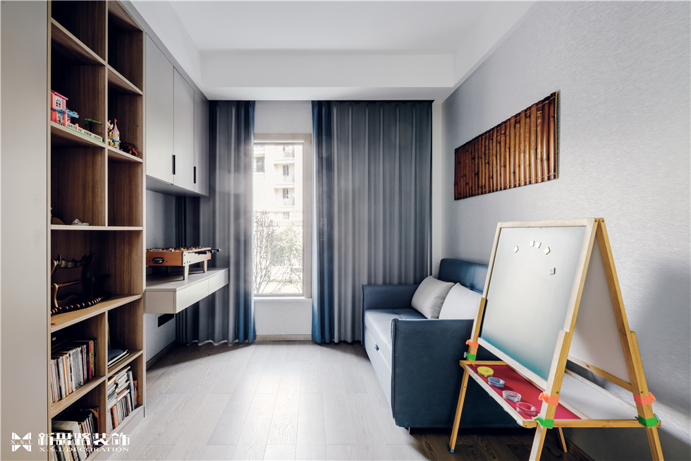 靠近客廳的房間改造成為獨立多功能房,打開門后即可和客廳連為一體,起到間接為客廳分擔部分功能的作用。既能作為休閑娛樂、客人下榻的場所,也能作為書房使用,滿足了客戶想擁有一個安靜閱讀、工作和學習環境的需求。超大的書柜作為書籍、玩具、擺件的收納之處非常不錯,書桌臨近窗戶,優秀采光更加護眼。