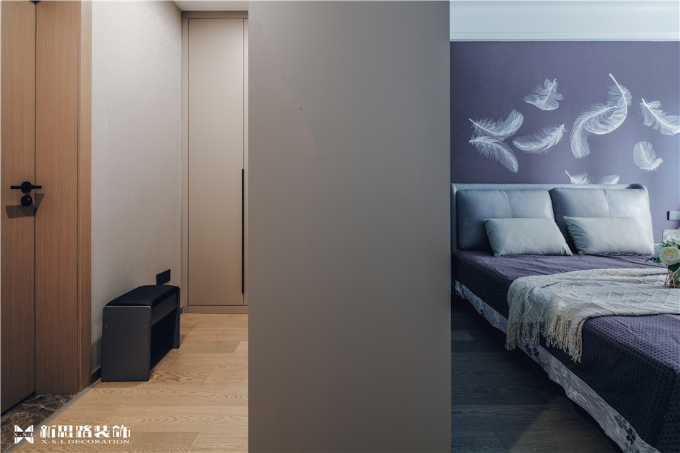 玄關放置換鞋凳,家中老人進出換鞋更方便。一旁的小吧臺能很好地起到隔斷作用,將父母房和衛生間隔開,使精簡功能分區更明確。吧臺上可放置物品,下方的柜體也能增加儲物空間,十分實用。
