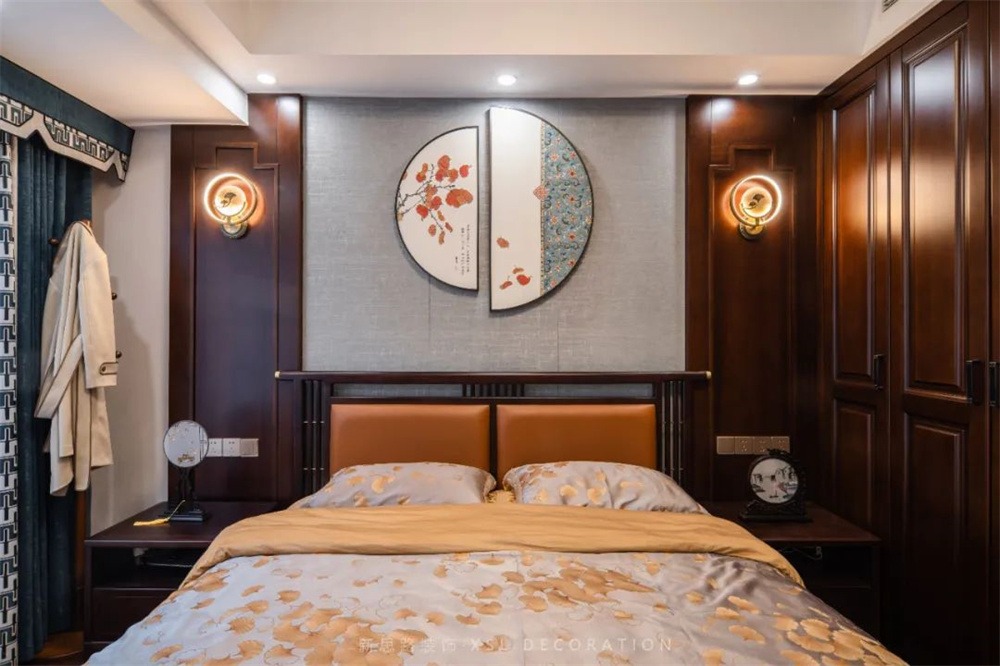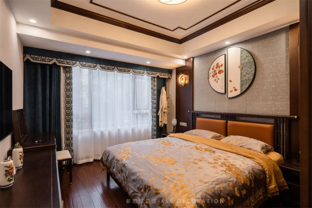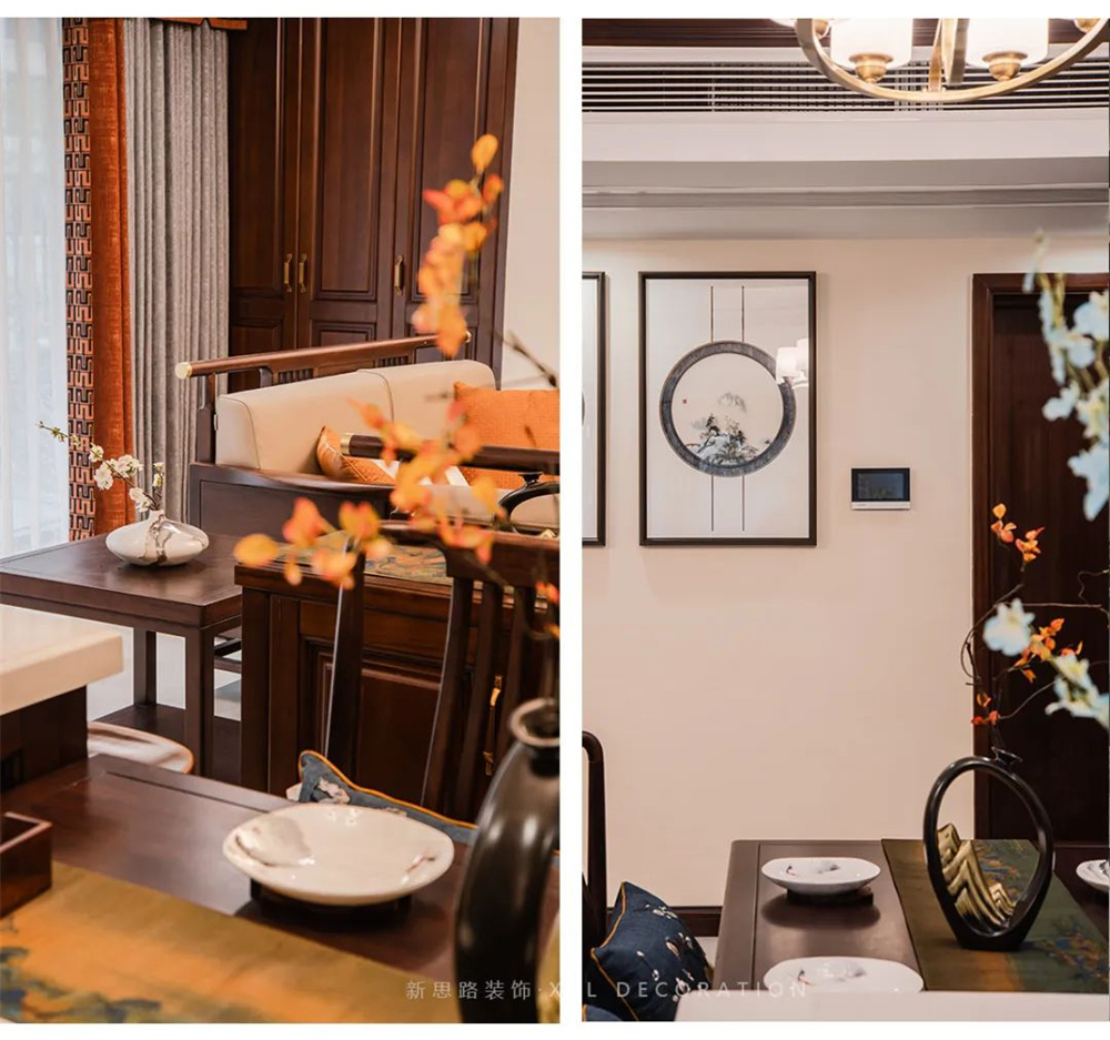 入戶玄關的視覺點用景和物做隔斷,半開半合中將視線引向內部空間,餐廳使用木色與廚房空間氛圍為一體,餐桌上采用“清明上河圖”布飾加以山水瓶插花營造出大氣氛圍;暖色微醺的光源散漫折射照其上,撩撥平靜的心緒,蕩起一絲漣漪。明亮色彩的碰撞,傳遞中式意蘊及趣味的同時,激活味蕾的感知;絲綢布藝與盤扣的細節點綴,調和深木色的沉悶印象,內斂延綿。