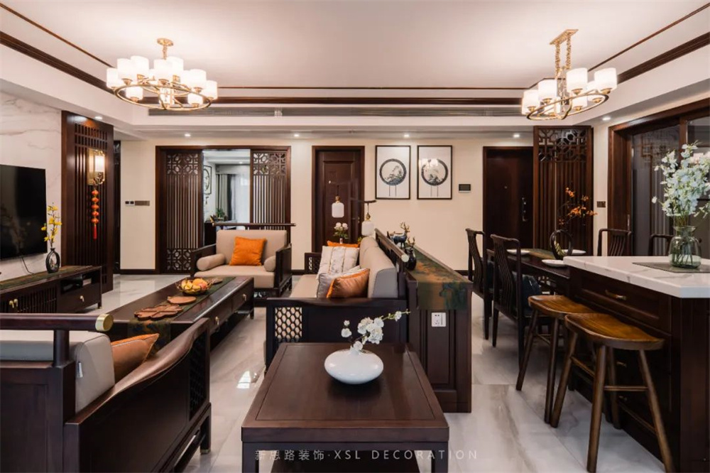 客廳空間衍脈自深厚邈遠的傳統文化,從家具的形制、流線、色澤,到墨枝斜逸、山掩人家的山水掛畫,均鐫刻著東方詩性的肌理,流露出自信大方的悠悠風骨。融合現代主義的簡約與傳統東方的形韻,令空間沾染著雅秀的氣質,清凈有格調。