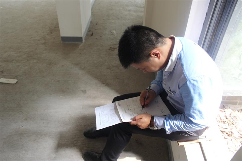 工程質(zhì)檢正在認(rèn)真填寫(xiě)客戶服務(wù)手冊(cè),以確認(rèn)本次進(jìn)場(chǎng)交底符合公司工程施工管理的相關(guān)規(guī)定。