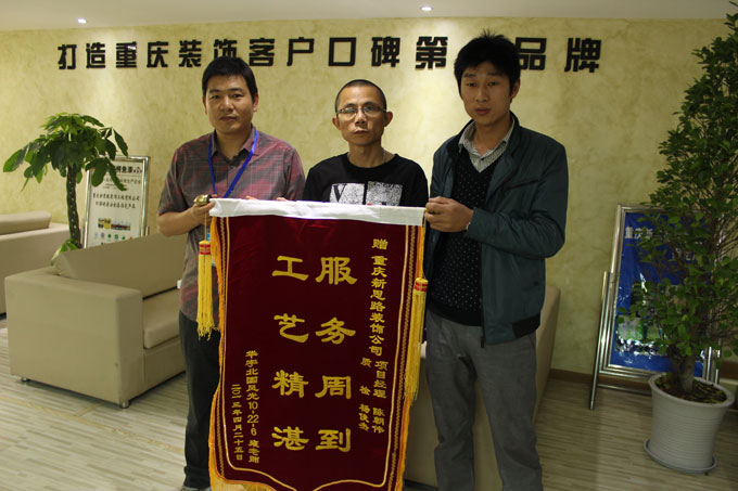 拿著這幅沉甸甸的錦旗,大家臉上都露出了欣慰的笑容,這不僅是對新思路裝飾“放心裝修、品質裝修”服務的高度認可,更是推動我們向更高的目標邁進的強大動力。我們一定會再接再厲,以打造重慶裝飾客戶口碑第一品牌為目標,服務好每一位業主,把每一位業主的家當做自己的家來設計和裝修,用信譽、質量以及貼心的服務打造更多的精品工程,放心工程,來回報我們的客戶。