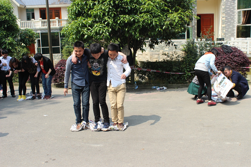 以“同舟共濟”游戲為例,游戲以小隊為單位,每隊派出3名隊員參賽,用報紙膠帶動手制作用來渡河的“舟”,制作好后3人站在“舟”上同心協力從起點到達終點。每個隊的造舟時間為五分鐘,時間到即停止造舟開始比賽,哪個小隊最先完成比賽即算勝利。這個游戲重點考驗團隊成員的協作性和默契度,細節決定成敗,一旦失誤就會對其他隊員造成直接影響。游戲過程中每位隊員分工合作,各司其職,團結一致,充分發揮集體智慧,為了共同的目標而拼盡全力。