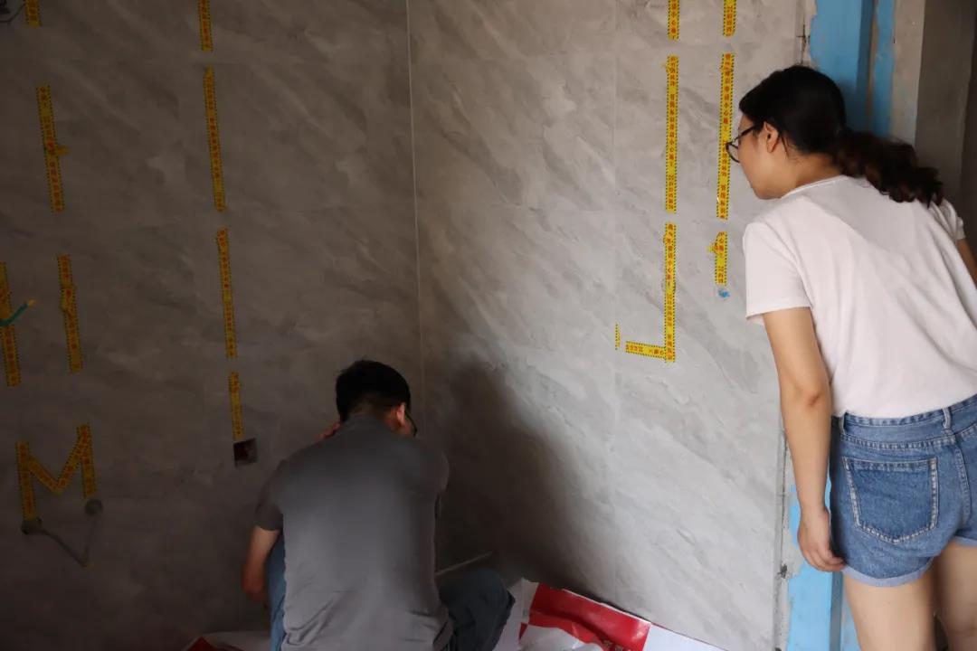 衛生間瓷磚拼貼完成后,接下來就要準備上馬桶、臺盆、柜子等的安裝。衛生間空間有限,各個物品的尺寸需要復核多遍,保證最后在安裝的時候能夠正好符合。為此,設計師敖元壩和業主再次對衛生間的一些尺寸進行了測量。